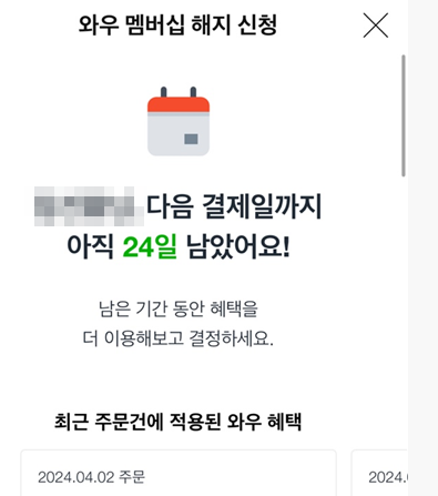 만약 월 구독료를 낸 지 1개월이 안되어 해지를 하셔도 만료일까지 쿠팡 와우 혜택을 누릴 수 있습니다.