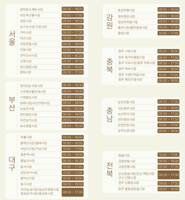 전국의 대부분 전통시장에서 온누리상품권을 사용할 수 있습니다. 시장 내의 다양한 상점에서 식료품, 의류, 생활용품 등을 구매할 때 사용할 수 있습니다.