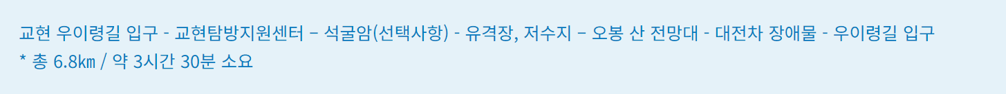 우이령길은 교현 우이령길 입구에서 시작하여 -> 고현탐방지원센터 -> 석굴암 -> 유격장, 저수지 -> 오봉 산 전망대 -> 대전차 장애물 -> 우이령길 이렇게 총 6.8km를 말하며 어른 걸음으로 약 3시간 30분이 소요되는 코스입니다.