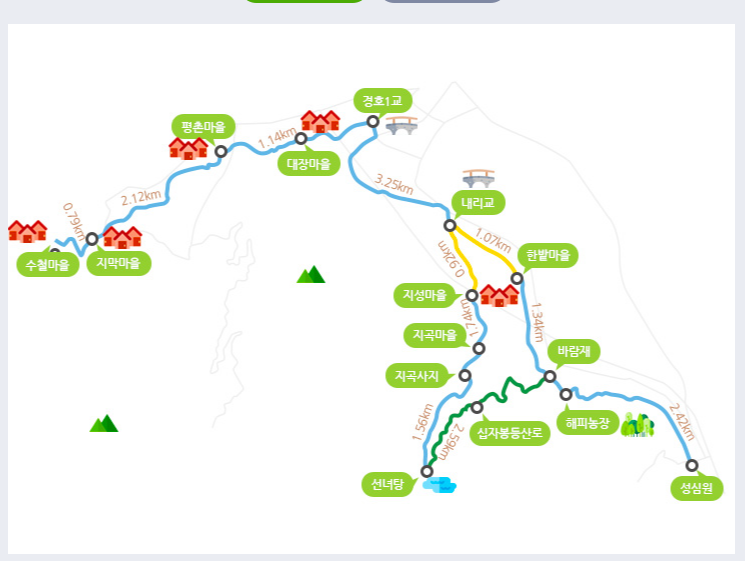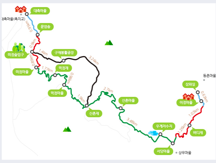수철 – 지막(0.8km) – 평촌(1.8km) – 대장(1.6km) – 내리교(3.4km) – 지성(1.1km) – 지곡사지(1.7km) – 선녀탕(1km) – 바람재(2.6km)-성심원(1.9km)
