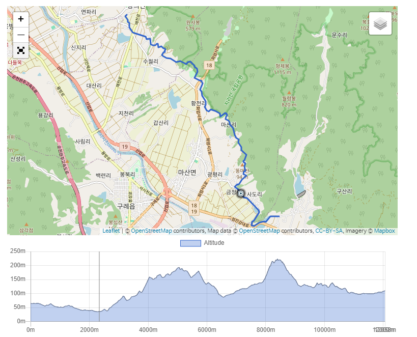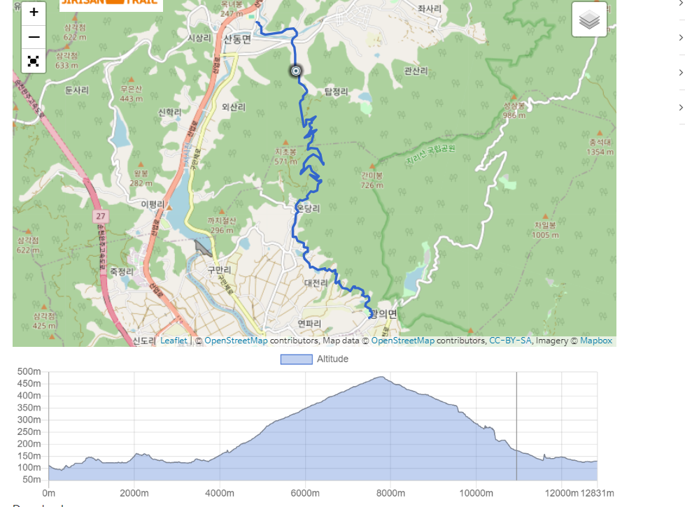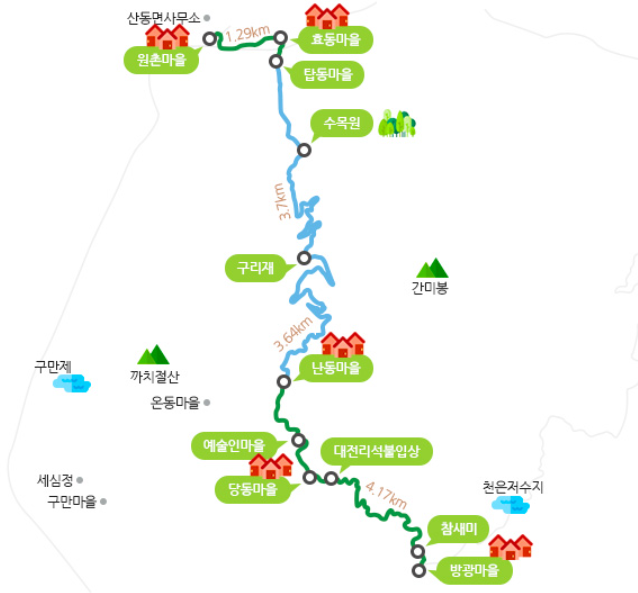 방광마을 – 난동갈림길(4.2km) – 구리재(3.7km) – 탑동마을 (3.7km) – 산동면사무소(1.4km)