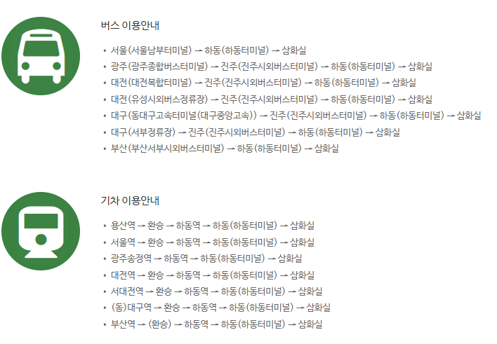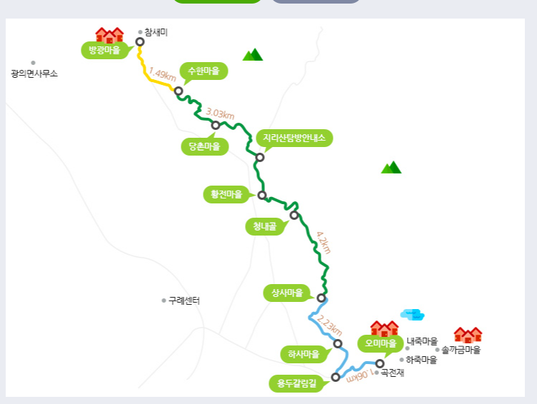 오미마을(운조루) – 용두갈림길(1.1km) – 상사마을(1.6km) – 지리산탐방안내소(5km) – 수한마을(3.2km) – 방광마을(1.4km)