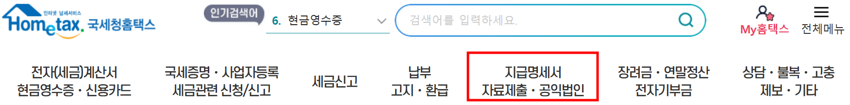1. 첫 화면 위 메뉴 중 지급명세서 자료제출/공인법인을 클릭합니다.