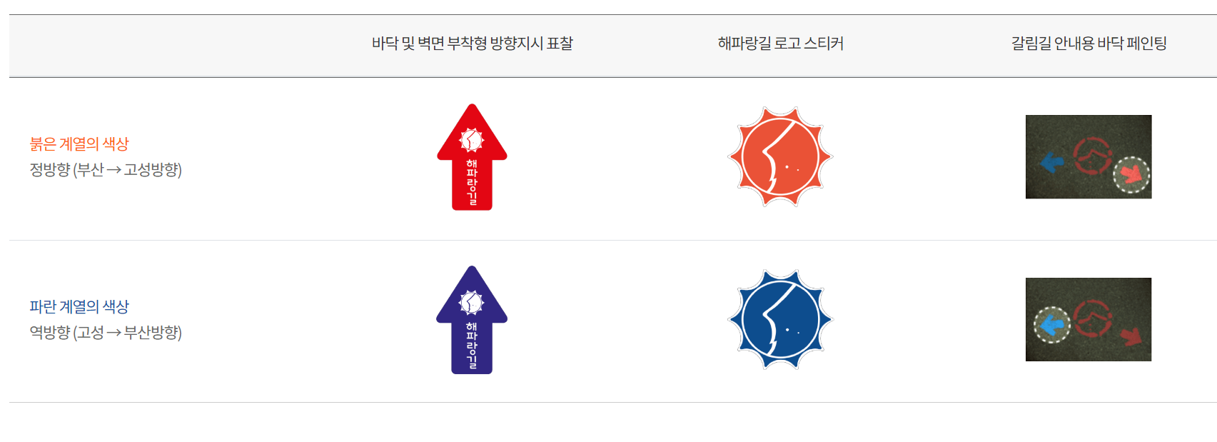 해파랑길은 빨간색과 파란색으로 방향을 나타냅니다.