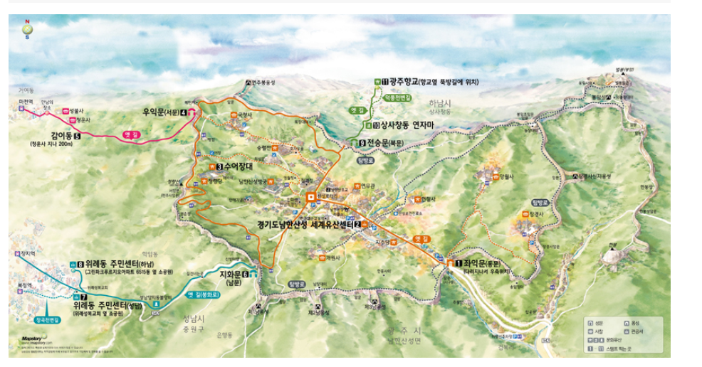 산성로터리에서 시작하여 남한산성 북문-서문-수어장대-영춘정-남문을 거쳐 산성로터리 다시 돌아오는 코스입니다.