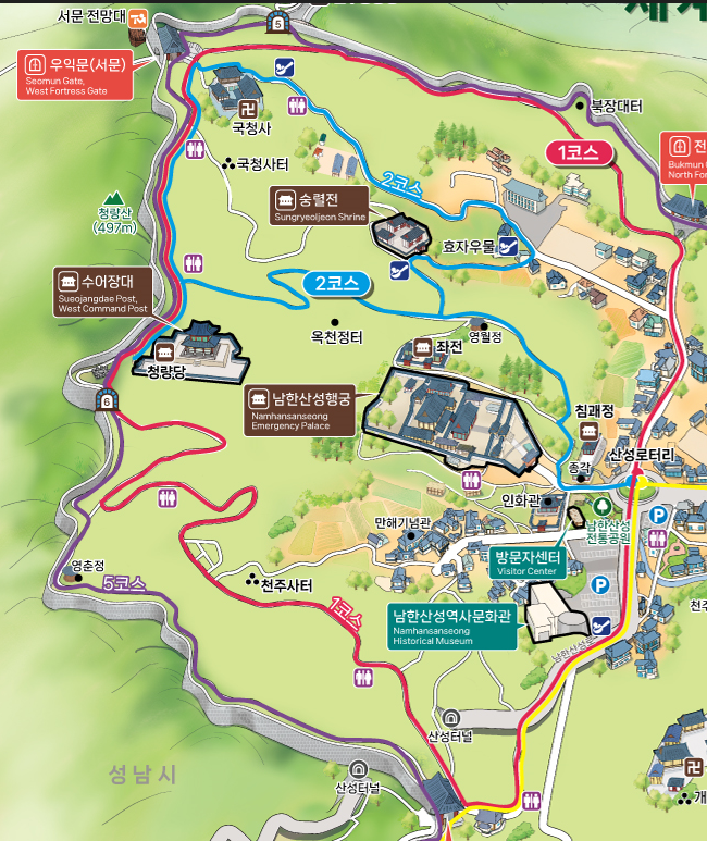 코스 : 산성로터리 - 영월전(0.4km) - 숭렬전(0.2km) - 서문(0.7km) - 수어장대(0.6km) - 산성로터리(0.9km)