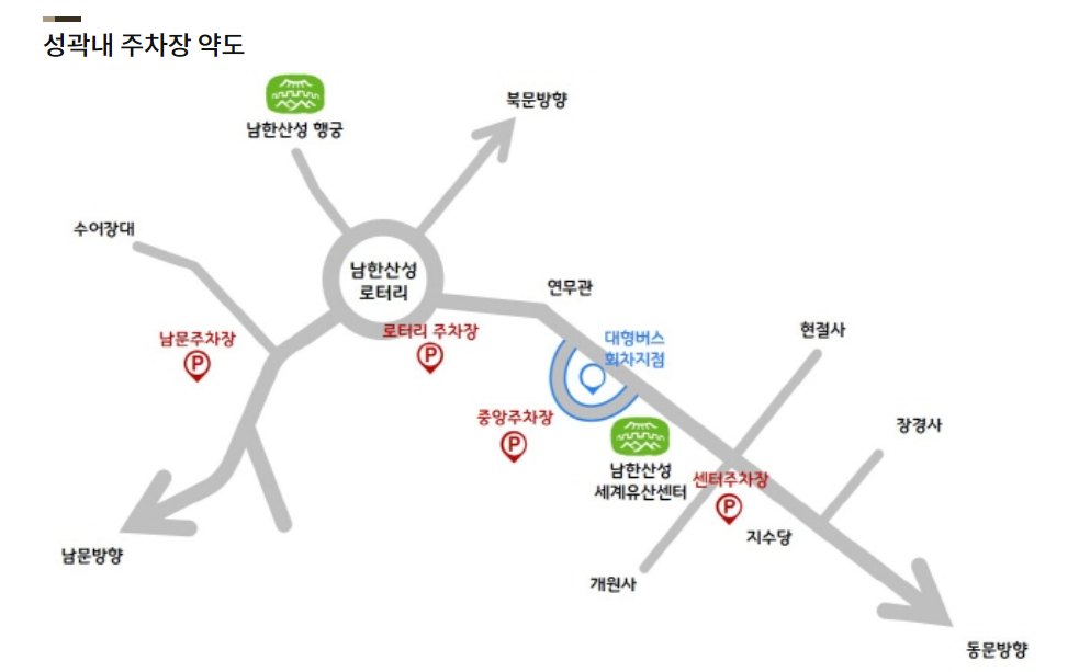 남한산성 성곽내에는 총 4개의 주차장이 있습니다. 남문주차장, 로터리주차장, 중앙주차장, 센터주차장입니다.