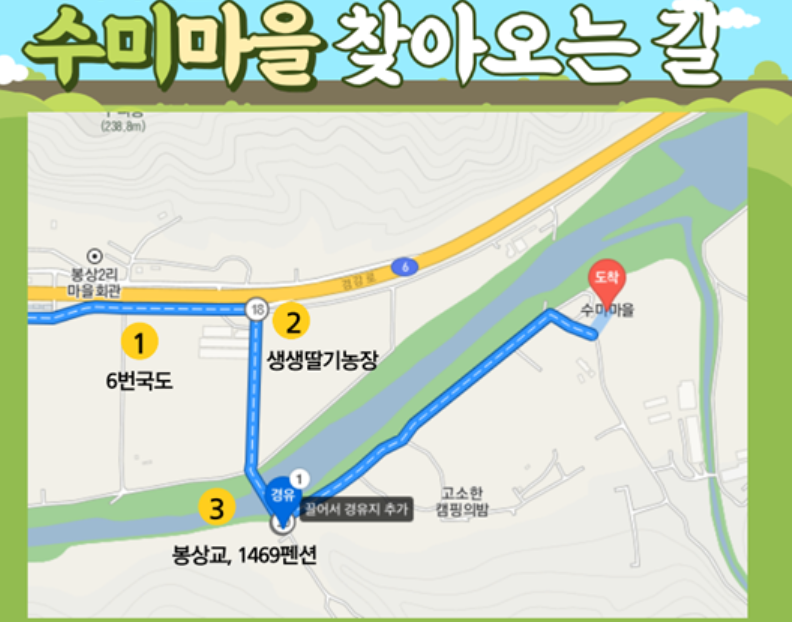 경부고속도로에서 양평 IC를 탄 뒤 6번국도를 따라 양평 방향으로 이동합니다. 경유지는 1469펜션으로 경유지에서 계속 직진하시면 수미마을에 도착할 수 있습니다.
