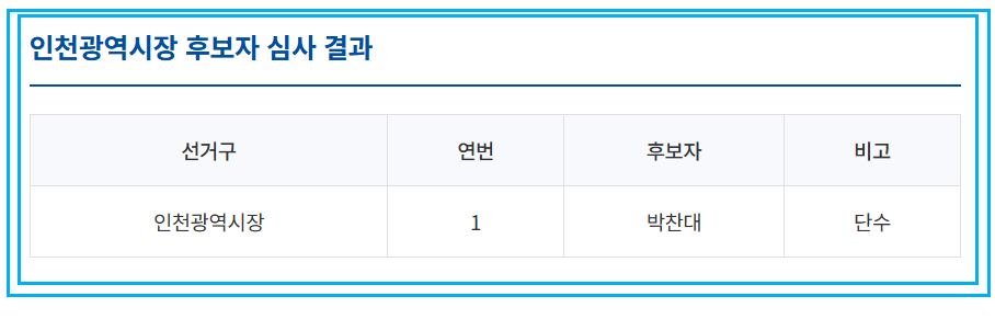 인천시장 선거에서는 박찬대 국회의원이 단수 공천을 받았습니다.
