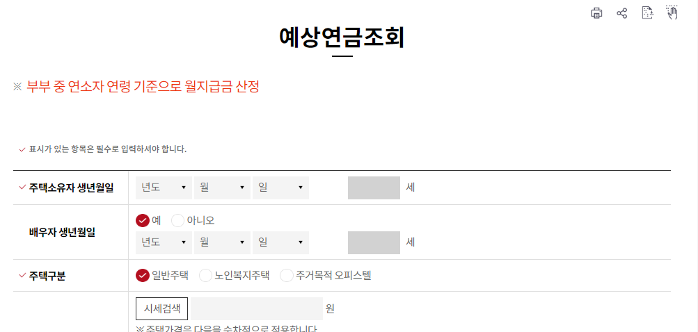 한국주택금융공사에서는 예상연금을 조회할 수 있는 계산기를 제공하고 있습니다.